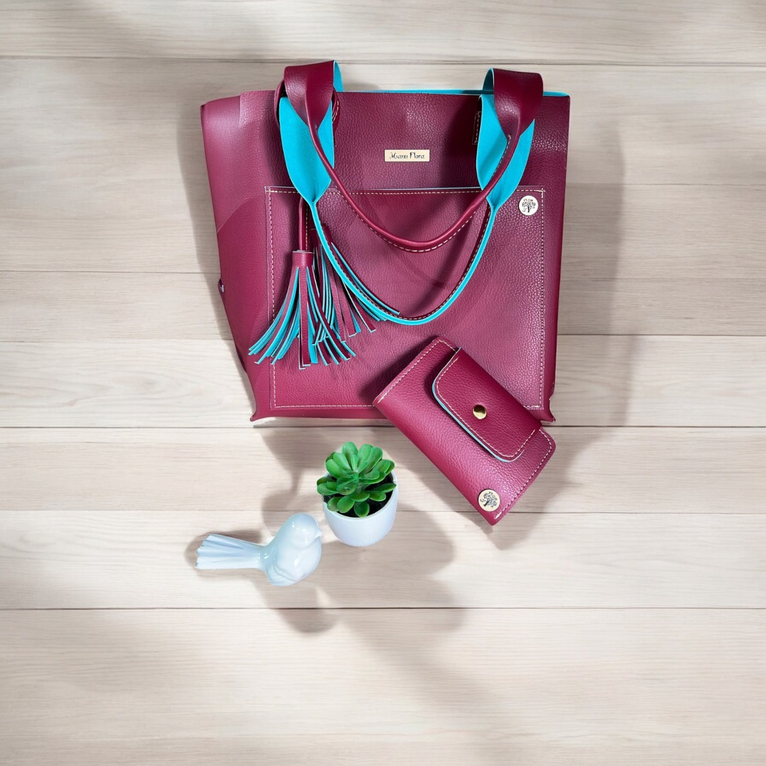 Em tons de vinho e azul, como um céu estrelado em uma noite de verão, te convida a sonhar alto, a se sentir confiante e poderosa. Bolsa espaçosa como um abraço acolhedor, guarda seus segredos, seus sonhos, seus momentos. Carteira compacta e elegante, organiza o essencial, te liberta para viver o agora.